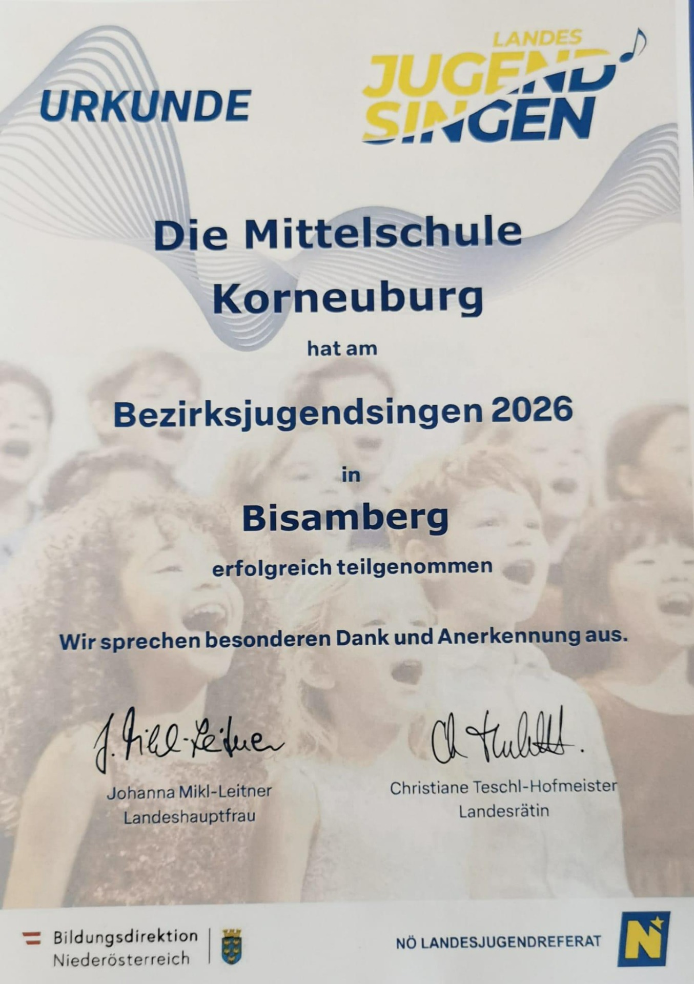 Die Kinder der 1b haben am 10.4.26 unter der Leitung von Karin Colard und Marie Schliegl beim Bezirksjugendsingen 2026 in Bisamberg mit ihrem afrikanischen Medley das Publikum in die warme Savanne mitgenommen. Nicht nur gesanglich, sondern auch instrumental war der Auftritt im Festsaal des Schlosses ein großer Erfolg.