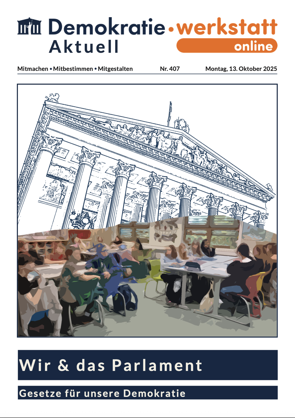 Am 13.10.2025 nahm die 2a an der Demokratiewerkstatt virtuell teil. Dabei lernten die Schüler:innen, was Demokratie bedeutet, welche Aufgaben das Parlament hat und wie Gesetze entstehen. Anhand von Videos, Audios und Impulsfragen erfuhren sie, wie Entscheidungen getroffen werden und warum es wichtig ist, sich zu informieren und aktiv am politischen Geschehen teilzunehmen. Gemeinsam mit Bediensteten des Parlaments erstellten sie zum Abschluss ihre eigene Zeitung.